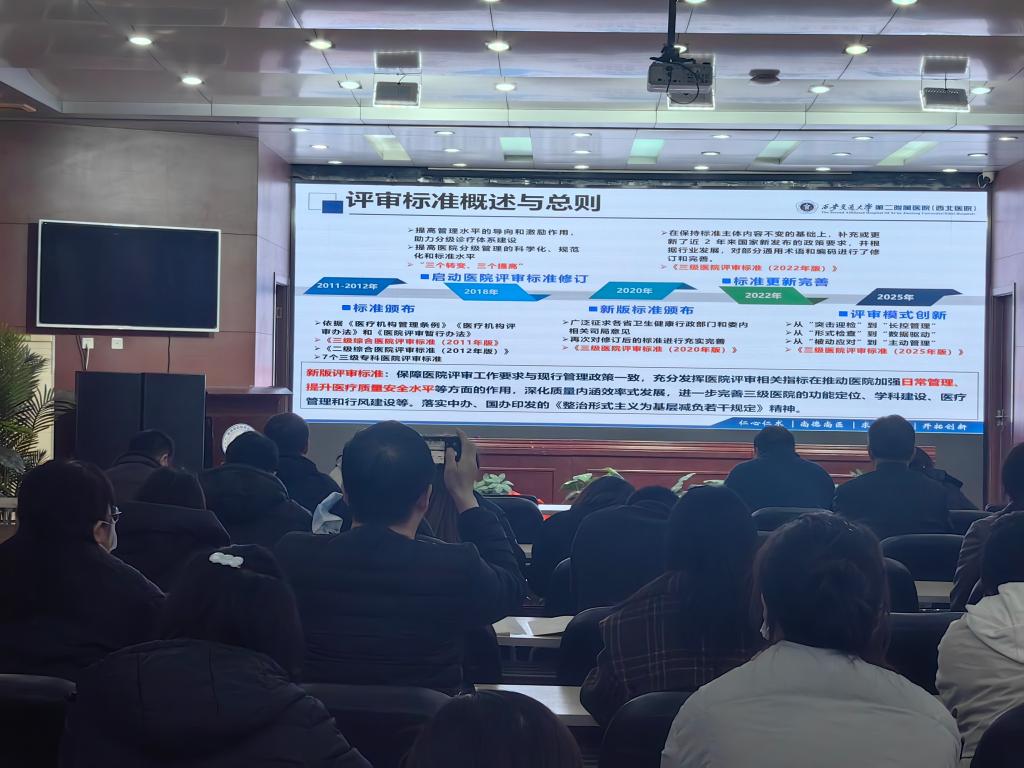 为深入贯彻落实三级甲等医院复审工作部署,推动全院精准把握《陕西省三级医院评审标准实施细则(2025年版)》核心要义,强化医疗质量安全管理能力,3月17日至26日,三甲办在学术厅组织开展了为期一周的“2025版三甲指标解读系列培训”。培训采用视频授课与现场组织相结合的形式,分阶段、分专业覆盖全院临床、医技、行政后勤等相关人员,累计参训千余人次。